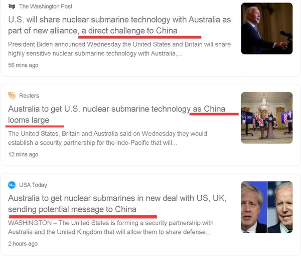 尽管美国政府官员对媒体否认了“针对中国”的说法,称此举是为了印太地区的“和平与稳定”,但几乎所有报道了此事的西方媒体都表示这三个盎格鲁撒克逊国家就是为了遏制中国。
