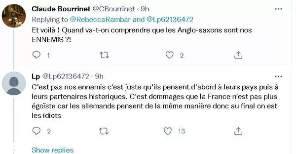 有法国人更是愤怒地宣泄说,此事证明了盎格鲁撒克逊人就是我们法国人的敌人,但也有人回应这种说法称,盎格鲁撒克逊人不是敌人,只是他们比法国人还有德国人更加自私而已,所以最后就会让法国人和德国人看起来像“傻子”。