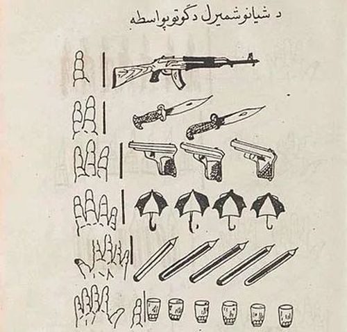 数学启蒙教材也不简单,教孩子们数数配的插图不是常见的“一支铅笔”“两个苹果”,而是“一把冲锋枪”“两把匕首”“三把手枪”等武器,课本中到处都有枪炮、子弹、地雷、炸弹和士兵的图片,字里行间灌输的是“圣战”思想和反对一切外来占领的信息。