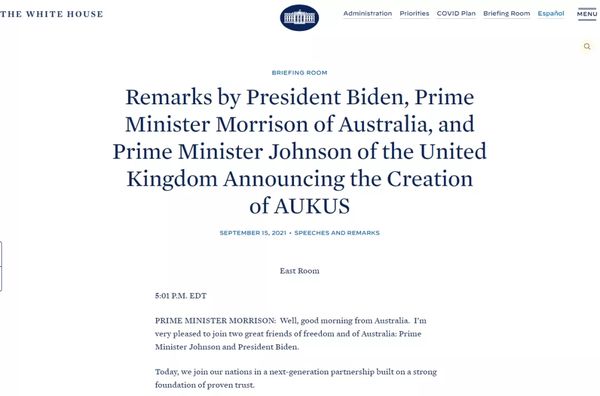 白宫通过一名不具名的资深官员向外界介绍,这将给予澳大利亚派遣潜艇在印太地区进行长期任务的能力。同时,“AUKUS”并非针对特定国家,而是关于“维护在印太地区参与跟威吓结构的更大努力”,“促进遵守国际准则”。