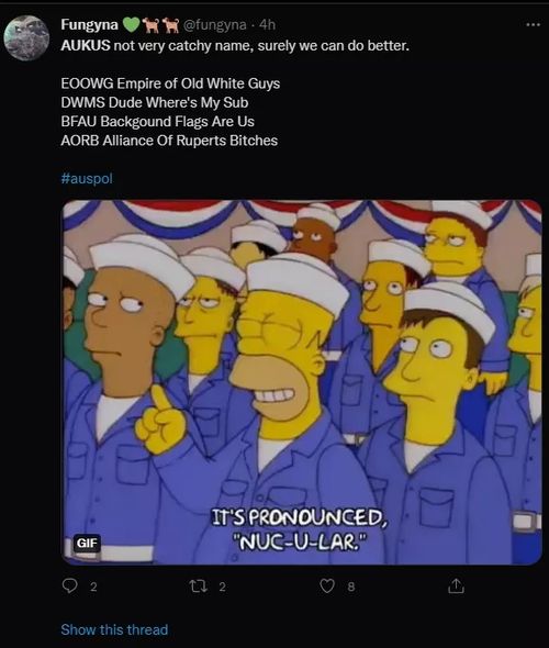 还有网友表示,“AUKUS”不确切,应该叫“EOOWG”(Empire of Old White Guys 老白男帝国)”,或者“AOE”(Axis of evil 三国邪恶轴心),或者“AORB”(Alliance of Ruperts Bi**hes,默多克姘头联盟,讽刺三国都被默多克控制)。