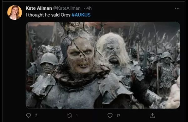 “AUKUS”公布后,其浓重的“盎格鲁-萨克逊”味道,在国际舆论中引起嘲讽。有澳大利亚女记者发推称,“AUKUS”拼错了,应该是“Orcs”(与“AUKUS”同音,是《指环王》中邪恶凶残的“兽人族”)。