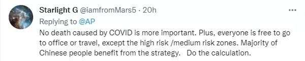 还有中国网友介绍说:“没有人因为新冠而死是更重要的事。另外,除了高风险/中风险地区,每个人都可以自由地去办公或旅行,大多数中国人受益于这个战略。你算一算吧。”↓