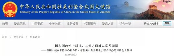 2021年9月22日,中国驻美国大使秦刚应邀出席卡特中心和乔治·布什美中关系基金会联合举办的线上对话会并发表演讲。秦大使还回答了与会人员的有关问题。答问内容如下:
