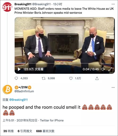 其实,消息的源头也是来自美国。美国内容机构Breaking911在北京时间9月22日5点45分发布了一段视频,配文称:“几分钟前,工作人员打断英国首相鲍里斯·约翰逊的话,命令新闻媒体离开白宫。”6分钟后,有288个粉丝的推特用户@Badinfinitum在北京时间9月22日5点51分点评了这段视频,称拜登大便失禁。
