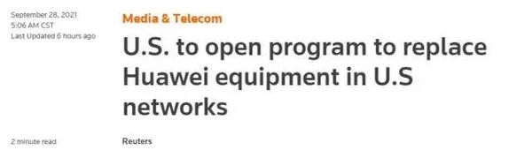 美国联邦通信委员会在2020年9月估计,从美国网络中移除和更换华为及中兴的设备将耗资18.37亿美元。
