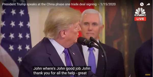这些努力最终取得了积极成果,2020年1月15日,中美签署第一阶段贸易协定。特朗普在向美国顶级商界和政治领导人发表演讲时3次感谢桑顿,他说:“约翰很棒!干得好,约翰!干得好,约翰!”