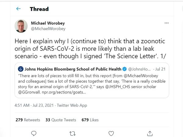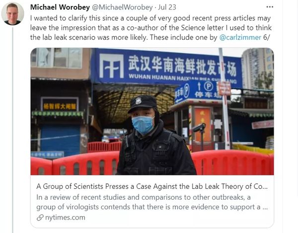 另一位参与联署的专家,亚利桑那大学进化生物学家迈克尔·沃罗比也在其个人推特上澄清道,人们因那个签名而误以为他认为“实验室泄漏”假说更可信,但这与事实并不相符,他仍然认为动物起源更有可能。