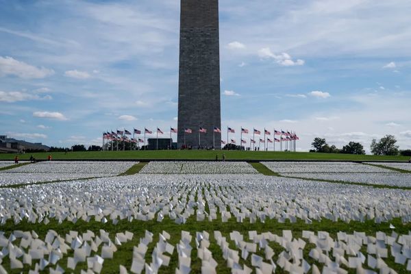 ▲当地时间2021年9月20日,美国华盛顿特区国家广场安插了65万面白旗,纪念新冠肺炎死者。(人民视觉)