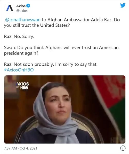 拉兹3日在接受美国Axios新闻网节目采访时发表了这番言论。她当时说,不仅有很多阿富汗人不信任美国政府和拜登政府,连她自己也不信任。
