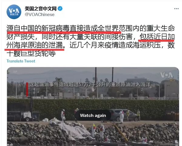 如下图所示,“美国之音”这家美国政府的官方喉舌,居然在10月6日中午的一则贴文中宣称,加州海岸的原油泄漏事故,是“源自中国”的新冠病毒“造成”的“间接伤害”。