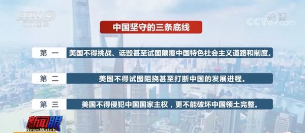 今年7月美国常务副国务卿舍曼来华访问。中国国务委员兼外长王毅表示,美新政府总体上延续了上一届政府的极端和错误对华政策,不断挑战中国底线,加大对中国遏制打压,中方对此坚决反对。为管控好双方存在的分歧,防止中美关系进一步下滑乃至失控,中方向美方提出三点基本要求,也是中方坚守的三条底线。