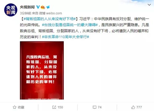 习近平:中华民族具有反对分裂、维护统一的光荣传统。台独分裂是祖国统一的最大障碍,是民族复兴的严重隐患。凡是数典忘祖、背叛祖国、分裂国家的人,从来没有好下场,必将遭到人民的唾弃和历史的审判!