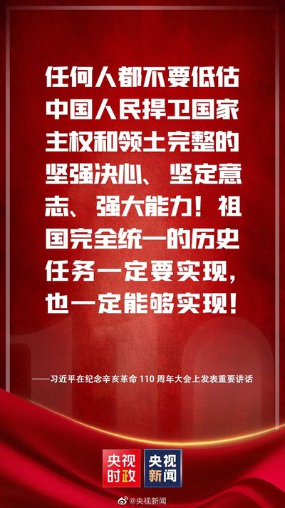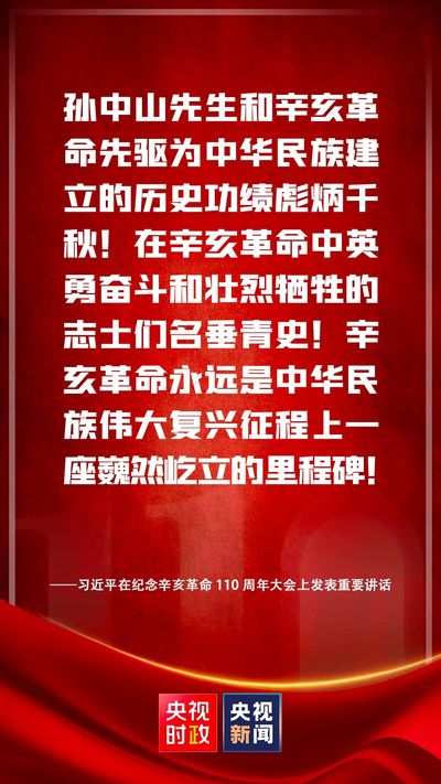 纪念辛亥革命110周年大会10月9日上午在北京人民大会堂隆重举行。中共中央总书记、国家主席、中央军委主席习近平出席大会并发表重要讲话。习近平:辛亥革命是中华民族伟大复兴征程上的一座里程碑习近平:……
