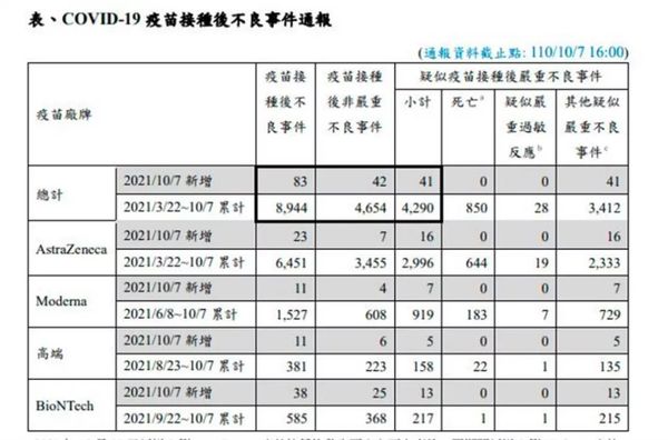 COVID-19疫苗接种后不良事件通报资料(图源:“中时新闻网”)