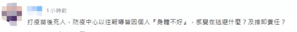 有岛内网友质疑,“打疫苗后死人,防疫中心以往报道皆因个人‘身体不好’,感觉在逃避什么?及推卸责任?”