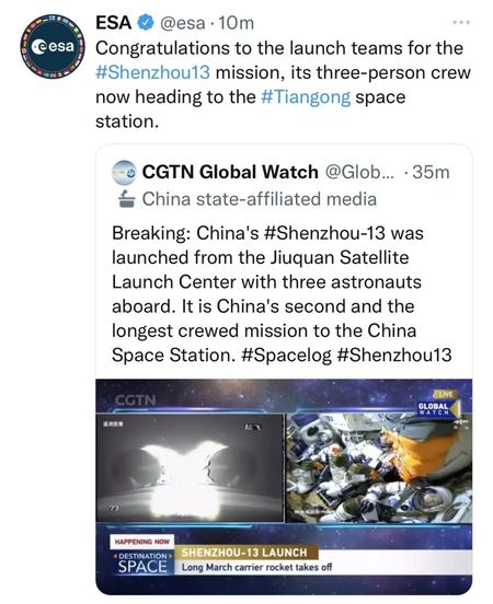 当地时间15日晚,欧洲航天局在社交媒体上第一时间转发了中央广播电视总台CGTN有关神舟十三号载人飞船发射升空的视频报道,并发文向神舟十三号的发射团队表示祝贺。欧空局还援引总台CGTN报道称,3名航天员随后将进入天和核心舱。