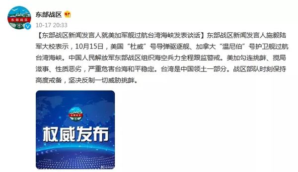 东部战区新闻发言人就美加军舰过航台湾海峡发表谈话东部战区新闻发言人施毅陆军大校表示,10月15日,美国“杜威”号导弹驱逐舰、加拿大“温尼伯”号护卫舰过航台湾海峡。……