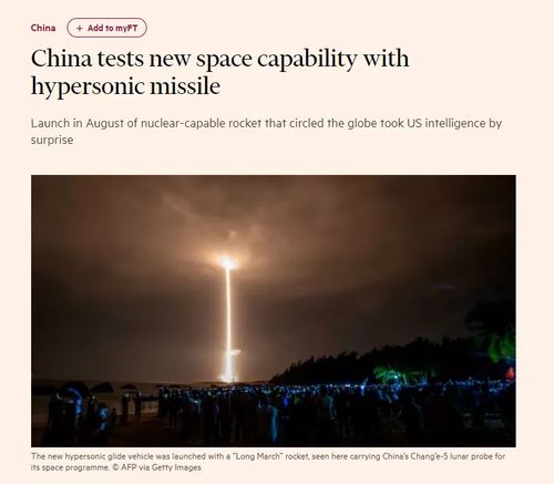 英国《金融时报》网站10月16日独家报道称,中国在8月份试射了一枚高超音速武器,但和以往不同的是,这枚导弹先是进入轨道以后进行“环绕地球”飞行,随后再重返大气层进行“高超音速滑翔”,不过最终战斗部落在距标靶二十余英里(约合30多公里)处。