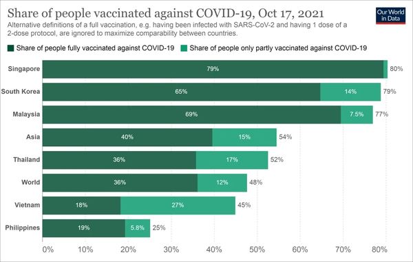 截至10月17日,部分亚洲国家疫苗接种情况(统计或有延迟) 图源:our world in data