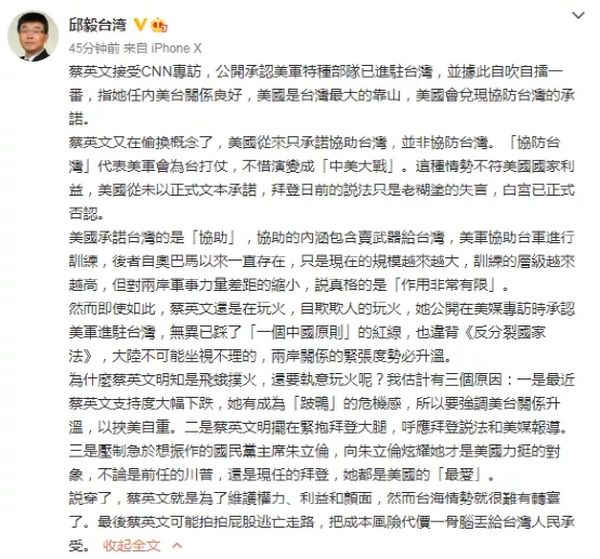 刚刚,台湾文化大学教授邱毅在微博发长文表示,民进党当局领导人蔡英文接受美国有线电视新闻网(CNN)专访,公开承认美军特种部队已进驻台湾,并据此自吹自擂,宣称她任内美台关系良好,美国是台湾最大的靠山,美国会兑现协防台湾的承诺。“蔡英文又在偷换概念了”,邱毅表示,美国从来只承诺协助台湾,并非协防台湾。