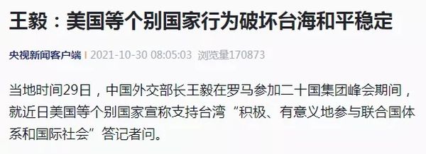 王毅:美国等个别国家行为破坏台海和平稳定当地时间29日,中国外交部长王毅在罗马参加二十国集团峰会期间,就近日美国等个别国家宣称支持台湾“积极、有意义地参与联合国体系和国际社会”答记者问。……