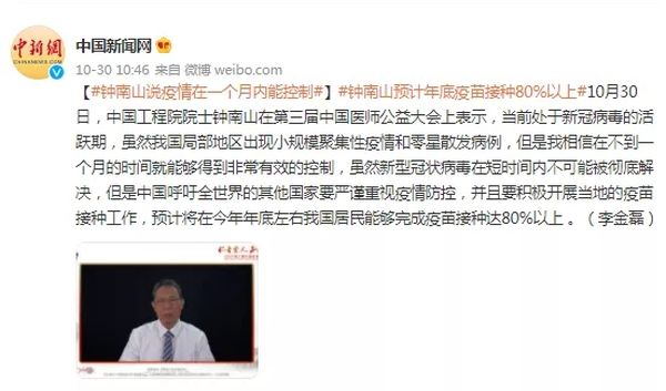 10月30日,中国工程院院士钟南山在第三届中国医师公益大会上表示,当前处于新冠病毒的活跃期,虽然我国局部地区出现小规模聚集性疫情和零星散发病例,但是我相信在不到一个月的时间就能够得到非常有效的控制,虽然新型冠状病毒在短时间内不可能被彻底解决,但是中国呼吁全世界的其他国家要严谨重视疫情防控,并且要积极开展当地的疫苗接种工作,预计将在今年年底左右我国居民能够完成疫苗接种达80%以上。