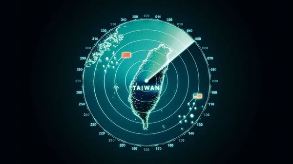 ▲ 英国《经济学人》2021年5月首期封面上,一张黑色的雷达图中心坐落着台湾岛,雷达扫描下,台湾岛的西北与东南角中美两国的国旗图标边闪烁着星星点点的信号源,似乎象征着战争一触即发。