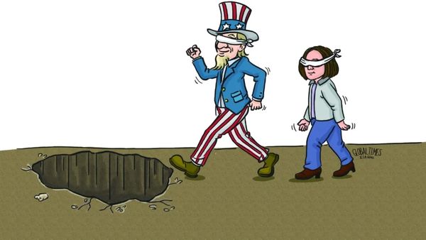 ▲ 对山姆大叔盲目亦步亦趋,民进党当局只会随其一同堕入深渊。(漫画 | 夏清)