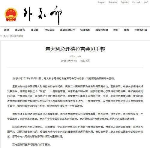 意大利总理会见王毅:意方坚持一个中国政策,支持北京冬奥会当地时间2021年10月31日,意大利总理德拉吉在罗马会见访问意大利的国务委员兼外长王毅。王毅首先转达中国领导人对德拉吉的亲切问候,……