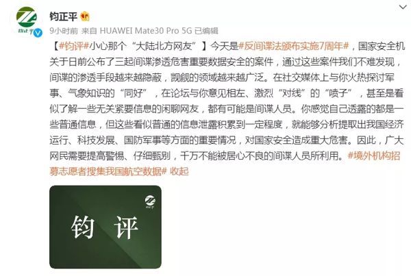 起因是近日我国家安全机关公布了三起间谍渗透危害重要数据安全的案件,“大陆北方网友”只是网友口中的一个代名词,他们看似是在社交媒体上与你火热地讨论军事、武器知识,分享航空、海洋知识的网友。而背后实际是伪装很深、很具有迷惑性的间谍,以及一些台湾“网军”人员。