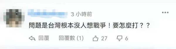 “问题是台湾根本没人想战争!要怎么打?”“整天在备战,到底是选你们来自杀的还是怎样?”