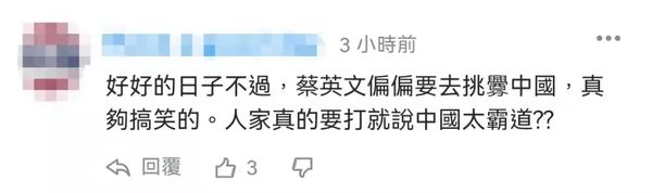 还有人留言称,“和平相处天下太平不是很好,为何要搞到剑拔弩张,受害的永远是百姓,好怀念以前两岸和平相处的日子”。只是,操弄两岸对立饮鸩止渴的民进党,能否听得到?