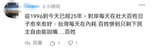 有民众感叹,“从1996年到今天已经25年。对岸每天在壮大,百姓日子越来越好,台湾每天在内耗,百姓惨到只剩下民主自由能说嘴……”“人家都已经超英超美了,民进党怎么不去死一死?”