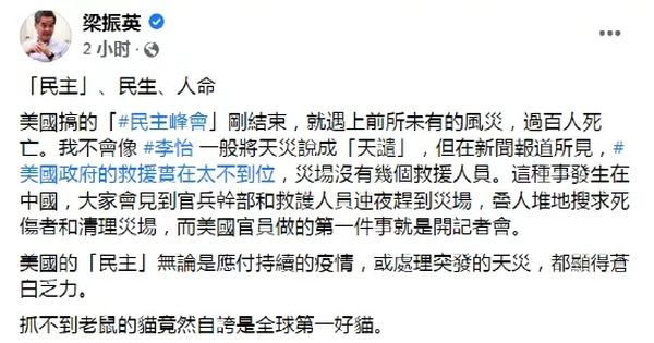 梁振英在脸书中表示,美国搞的“民主峰会”刚结束,就遇上前所未有的风灾,过百人死亡。“我不会像李怡一样将天灾说成‘天谴’,但在新闻报道所见,美国政府的救援实在太不到位,灾场没有几个救援人员。”这种事若发生在中国,大家会见到官兵干部和救护人员连夜赶到现场,“叠人堆地搜救死伤者和清理灾场,而美国官员做的第一件事就是开记者会”。