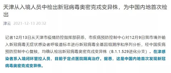 记者12月13日从天津市疫情防控指挥部获悉,市疾病预防控制中心对12月9日我市境外输入新冠病毒无症状感染者呼吸道标本进行新冠病毒全基因组测序和序列分析,经中国疾病预防控制中心复核,均确认检出新冠病毒奥密克戎变异株(B.1.1.529进化分支)。在津感染者系入境闭环管控人员,目前于定点医院隔离治疗。据悉,这是中国内地首次发现新冠病毒奥密克戎变异株。