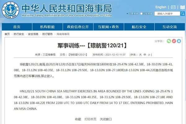 二是三亚海事局发布航行警告:自2021年12月15日至17日每天6时至18时在南海海域18-29.47N 108-42.38E、18-30.03N 108-41.08E、18-33.12N 108-40.35E、18-33.12N 108-29.50E、18-13.02N 108-27.18E和18-13.02N 108-44.22E诸点连线水域范围内进行军事训练,禁止驶入。