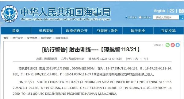 中国海事局网站13日发布了三条航行警告,都与解放军在相关海域进行实弹射击训练有关。一是清澜海事局发布航行警告:2021年12月15日,6时至19时,在南海海域A:19-57.25N/111-09.13E、B:19-57.25N/111-14.88E、C:19-51.80N/111-14.88E、D:19-51.80N/111-09.13E诸点连线范围内进行实弹射击训练,禁止驶入。