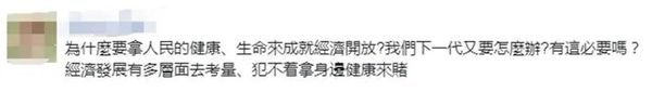 还有网友质疑,“为什么要拿人民的健康、生命来成就经济开放?我们下一代又要怎么办?有这必要吗?经济发展有多层面去考量,犯不着拿身边健康来赌。”