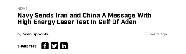 果然,美国军事新闻网站(SOFREP)19日就认为,美国高能激光武器针对的目标不只有伊朗,还包括中国。