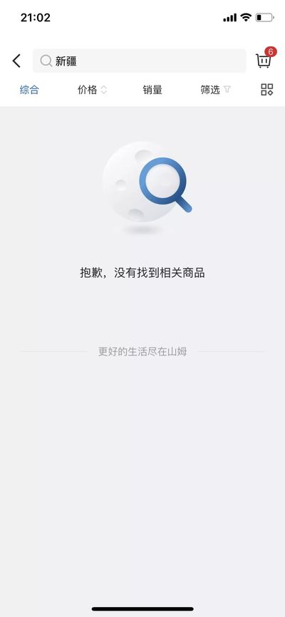当晚9时,打开“山姆会员商店”APP搜索栏,打出“新疆”两字,即出现“新疆哈密瓜”、“新疆和田红枣”、“新疆杏”等多个含“新疆”关键词供选择。但真正搜索“新疆”之后,却得到了“抱歉,没有找到相关商品”的结果。