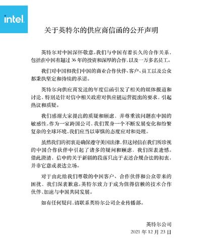 12月23日,美国彭博社报道了英特尔公司在中国的道歉。此前,英特尔在向供应商发送的年度信函中,对来自新疆地区的产品进行了限制。