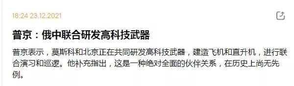 具体到军事合作领域,普京表示,“莫斯科和北京正在共同研发高科技武器,建造飞机和直升机,进行联合演习和巡逻。他补充指出,这是一种绝对全面的伙伴关系,在历史上尚无先例。”