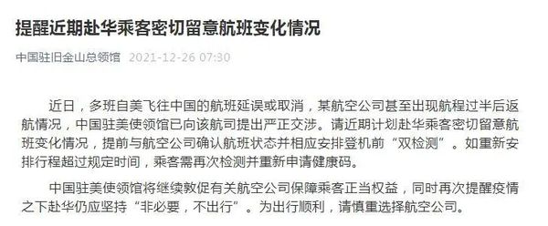 近日,多班自美飞往中国的航班延误或取消,某航空公司甚至出现航程过半后返航情况,中国驻美使领馆已向该航司提出严正交涉。请近期计划赴华乘客密切留意航班变化情况,提前与航空公司确认航班状态并相应安排登机前“双检测”。如重新安排行程超过规定时间,乘客需再次检测并重新申请健康码。