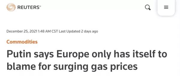“普京说,天然气价格飙升只能怪欧洲自己。”路透社25日以此为题报道称,面对欧洲天然气价格本周创历史新高,俄罗斯总统普京24日表示,欧盟只能将创纪录的天然气价格归咎于其自身政策,因为一些欧盟成员国在其内部以高得多的价格转售廉价的俄罗斯天然气。