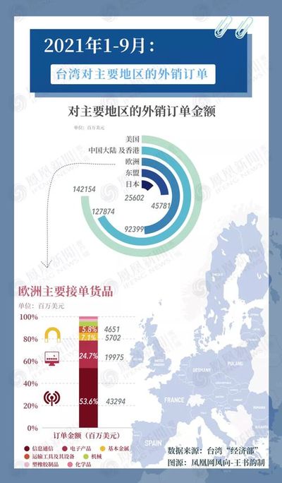 欧洲很清楚地意识到,有约2400万人口的台湾是一个大市场。统计数据显示,2020年,欧洲是台湾的第三大出口地区,台湾是欧盟第十四大贸易伙伴,台欧贸易逐年上升。2021年前三季度,台湾向欧洲出口金额为924亿美元,次于美国和中国大陆及香港,年增长率为32.85%,其中出口的产品以信息通信和电子产品为主,占比总出口的八成左右。