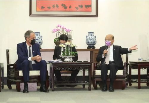 ▎11月3日,苏贞昌与欧洲议会代表团成员拉斐尔·格鲁克斯曼 (Raphael Glucksmann) 讨论台欧关系 图源:美联社