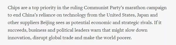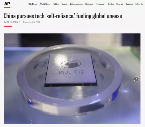 美联社在28日的报道里称,中国官方正推动几大科技巨头针对我国较为薄弱的科技领域加大投入,力求能尽快摆脱对外国芯片等核心技术的高度依赖。而如果中国成功实现了这一目标,就会“妨碍全球创新、破坏自由贸易,会让世界经济脱钩和分裂。”