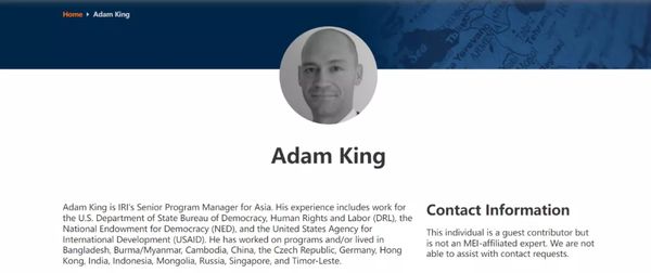 亚当·金现为 “美国国际共和研究所”(IRI)在港授权代表,曾在美国国务院民主人权和劳工局 (DRL)、国家民主基金会 (NED) 和美国国际开发署(USAID)任职。