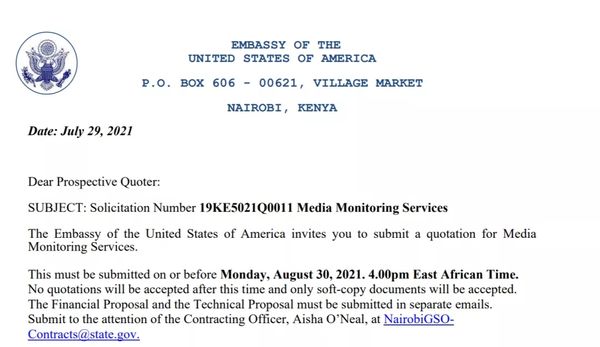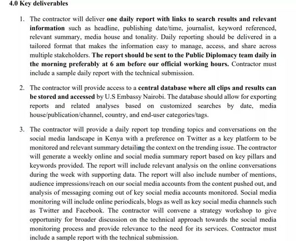 在了解外界舆论方面,许多西方国家政府也在针对社交媒体采购这样的服务。比如在一份今年7月由美国驻肯尼亚大使馆发布的招标文件中就写到,美国大使馆需要一家公司为其提供肯尼亚的“网络舆论服务”,包括媒体发表报道、记者个人发表的言论以及社交媒体上的热门话题等等。耿直哥前面提到的那位来自其他国内媒体的热心友人还发现,其他国家的美国大使馆也招标过类似的“网络舆论”服务。